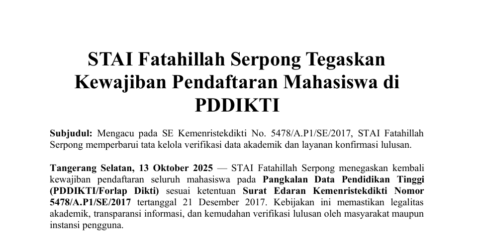 STAI Fatahillah Serpong menegaskan kembali pentingnya pendaftaran seluruh mahasiswa ke dalam Pangkalan Data Pendidikan Tinggi (PDDIKTI/Forlap Dikti) sesuai ketentuan Surat Edaran Kemenristekdikti Nomor 5478/A.P1/SE/2017 tertanggal 21 Desember 2017, sebagai langkah untuk memastikan legalitas akademik, transparansi informasi, serta kemudahan verifikasi data lulusan oleh masyarakat maupun instansi pengguna. Berdasarkan aturan tersebut, setiap perguruan tinggi, baik negeri maupun swasta di bawah Kemenristekdikti, diwajibkan melakukan pelaporan mahasiswa mulai angkatan 2003/2004, sedangkan bagi Perguruan Tinggi Keagamaan pelaporan dimulai sejak 2009/2010 dan bagi perguruan tinggi di bawah Kementerian/Lembaga atau LPNK dimulai sejak 2012/2013. STAI Fatahillah Serpong secara aktif menindaklanjuti kebijakan ini dengan melakukan pemutakhiran data akademik mahasiswa secara berkala melalui BAAK dan operator PDDIKTI, menyediakan layanan verifikasi terpadu bagi instansi dan mitra kerja melalui helpdesk kampus, serta menerbitkan surat pernyataan lulusan resmi yang dilengkapi nomor surat, QR verifikasi, dan tautan pengecekan ke sistem PDDIKTI. Selain itu, pihak kampus juga terus melakukan sosialisasi kepada mahasiswa dan alumni mengenai pentingnya kesesuaian identitas, NIK, NISN, serta data akademik lainnya agar tercatat dengan benar dalam sistem nasional. Melalui langkah-langkah ini, STAI Fatahillah Serpong berkomitmen memperkuat akuntabilitas institusi, meningkatkan kepercayaan publik, dan memastikan setiap lulusan tercatat sah secara resmi dalam PDDIKTI, sesuai dengan semangat transparansi dan integritas akademik yang diamanatkan oleh pemerintah.